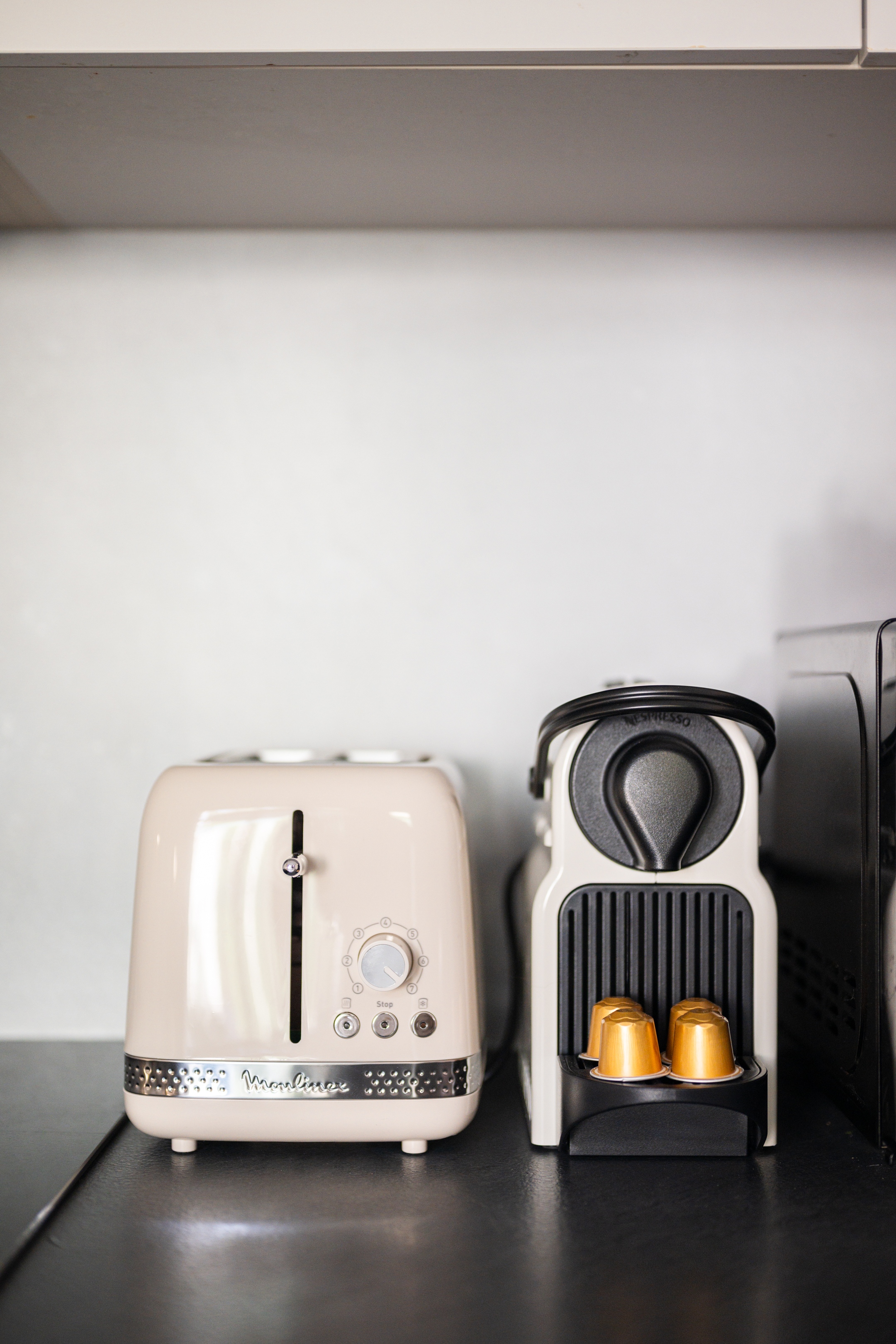Fully equipped kitchen, open to the living area, with everything you need: fridge, freezer, microwave, stove, toaster, Dolce Gusto coffee machine, and kitchen utensils.
